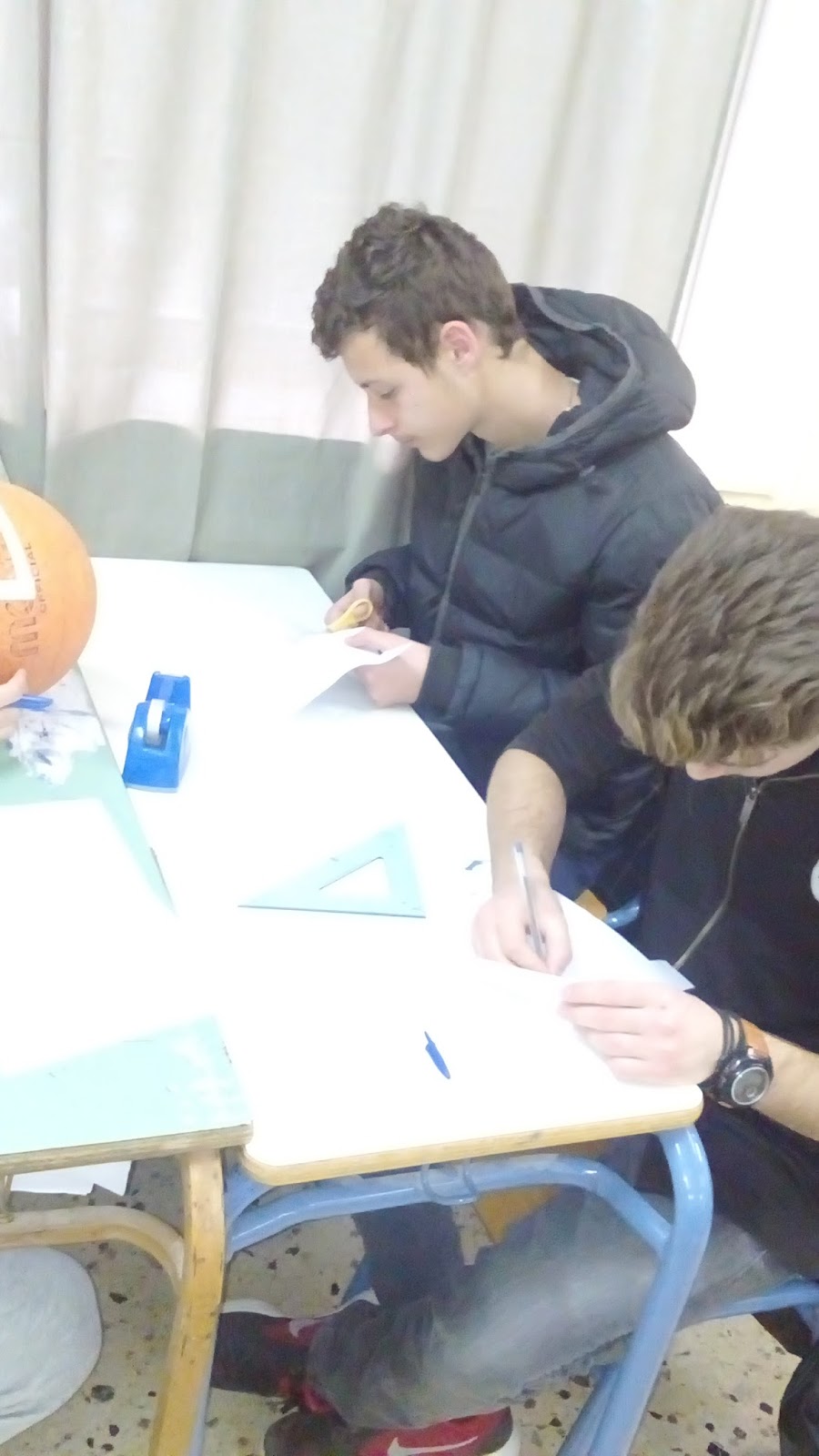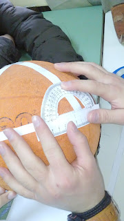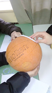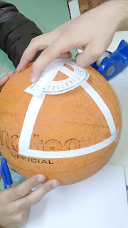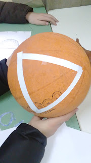 Αρχικά κόψαμε πάνω σε μια κόλλα Α4 τρεις ισομήκεις λωρίδες χαρτιού οι οποίες προσομοιώνουν στο ευκλείδειο επίπεδο τις ευθείες γραμμές. Πάνω στο «κοίλο» επίπεδο της ελλειπτικής γεωμετρίας (π.χ επιφάνεια μιας σφαίρας) οι ευθείες μετασχηματίζονται σε καμπυλωτές γραμμές. Αυτό φαίνεται αν κολλήσουμε τις λωρίδες πάνω στην κοίλη επιφάνεια μιας μπάλας μπάσκετ (σφαίρας). Στη συνέχεια φροντίζουμε να τις κολλήσουμε με τέτοιο τρόπο ώστε να σχηματίζουν τρίγωνο (σφαιρικό τρίγωνο).