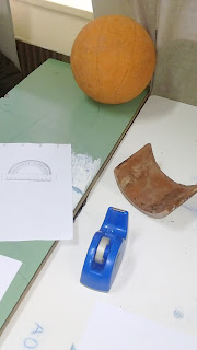 Στο πρώτο μάθημα συζητήθηκε το ζήτημα των μη ευκλείδειων γεωμετριών , της ελλειπτικής και της υπερβολικής που προέκυψαν από την ανεξαρτησία του 5ου αιτήματος του Ευκλείδη.Επίσης συζητήσαμε για το άθροισμα των γωνιών ενός τριγώνου που είναι μεγαλύτερο από δύο ορθές στην ελλειπτική γεωμετρία , μικρότερο από δύο ορθές στην υπερβολική και ίσο στην ευκλείδεια γεωμετρία. Η συγκεκριμένη πειραματική δράση που πραγματοποιήθηκε στην δεύτερη διδακτική ώρα έρχεται να επιβεβαιώσει πειραματικά ότι αυτό το συμπέρασμα των μη ευκλείδειων γεωμετριών δεν είναι απολύτως εξωπραγματικό και αντίθετο από την εποπτική μας διαίσθηση , αν κι έτσι φαίνεται σε πρώτη ανάγνωση. Το πρώτο συμπέρασμα μπορεί να επαληθευτεί στην περίπτωση που το επίπεδο μας θεωρηθεί η κοίλη επιφάνεια μιας σφαίρας και το δεύτερο αν το επίπεδο θεωρηθεί η επιφάνεια ενός υπερβολοειδούς. Σε κάθε ομάδα δόθηκαν τα παρακάτω χειραπτικά υλικά: