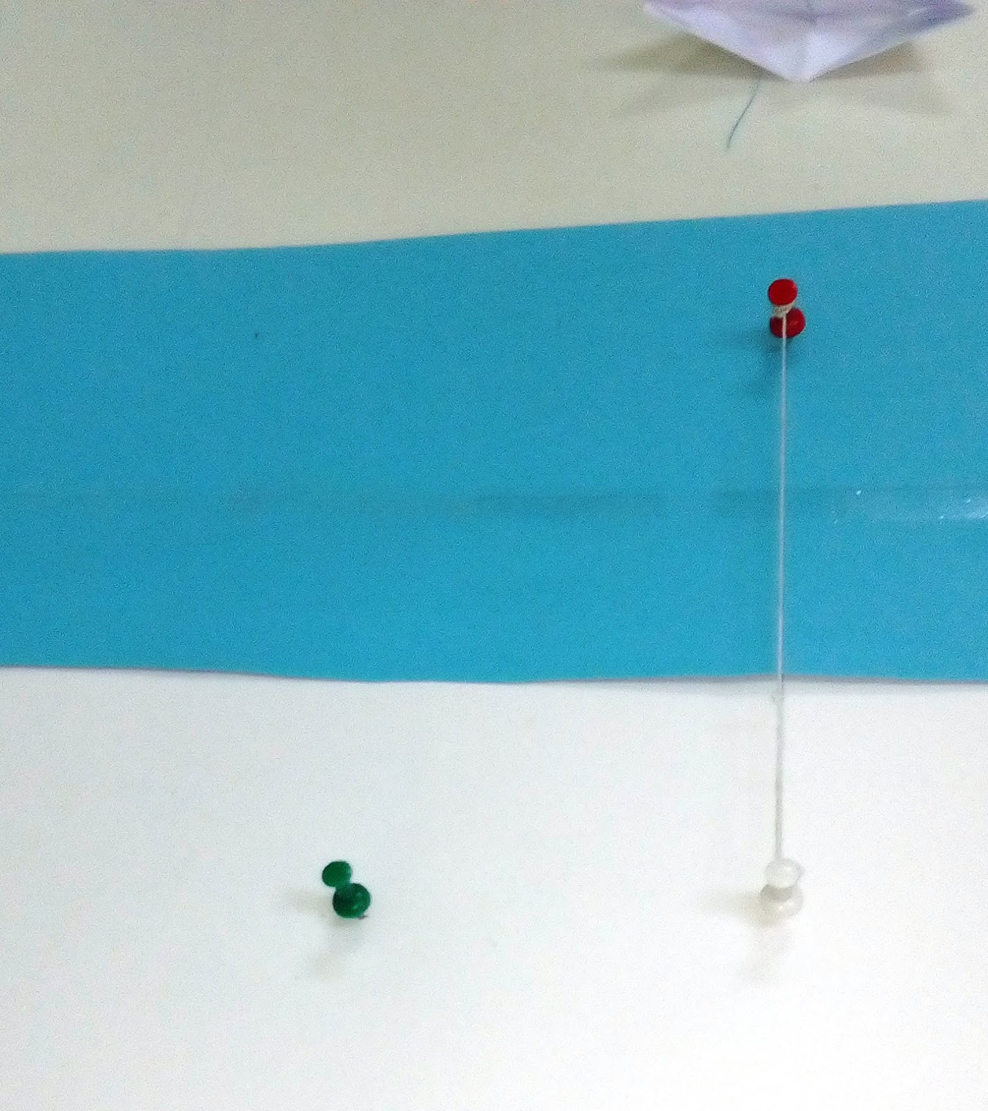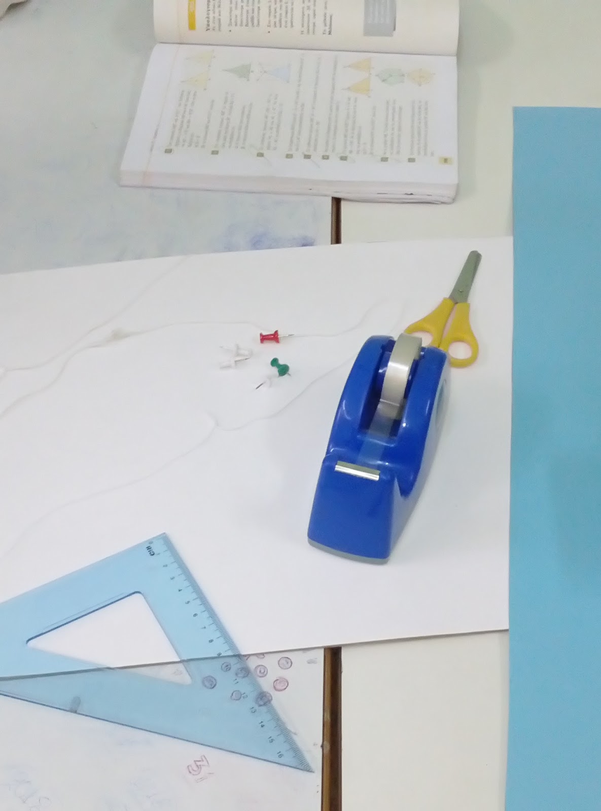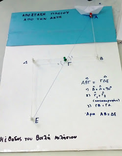 Ουσιαστικά απεικονίσαμε πάνω στο μακετόχαρτο το σχέδιο που ακολούθησε ο Θαλής ο Μιλήσιος για να υπολογίσει την απόσταση ενός πλοίου από την ακτή. Στα σημεία που χρησιμοποίησε για να βάλει σημάδι ( σελ 197 σχολικού βιβλίου μαθηματικών γ΄ γυμνασίου) , τοποθετήσαμε πινέζες πίνακα ανακοινώσεων. Τις αποστάσεις που μέτρησε ο Θαλής τις προσομοιώσαμε με κομμάτι σπάγκου που δενόταν από πινέζα σε πινέζα( σημάδι σε σημάδι).